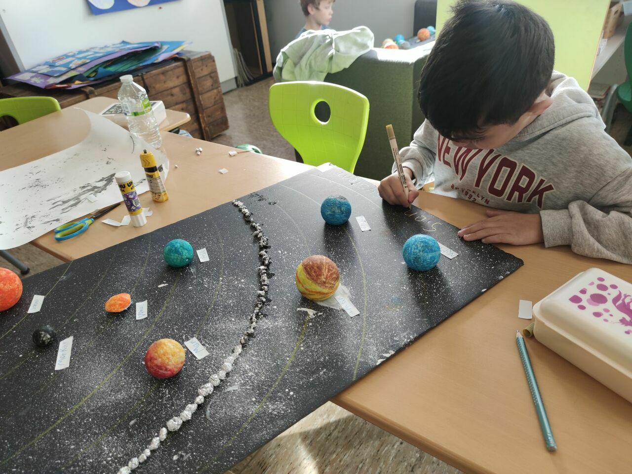Für das Unterrichtsthema „Planeten“ hat die Klasse 2b ein Sonnensystem gebastelt.