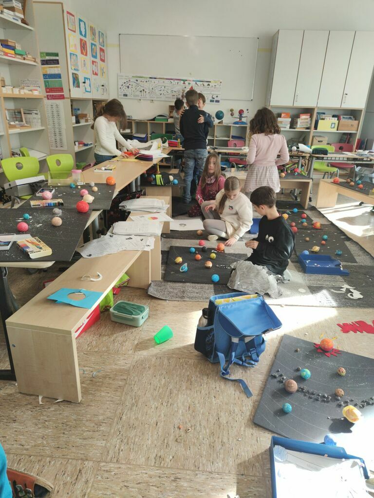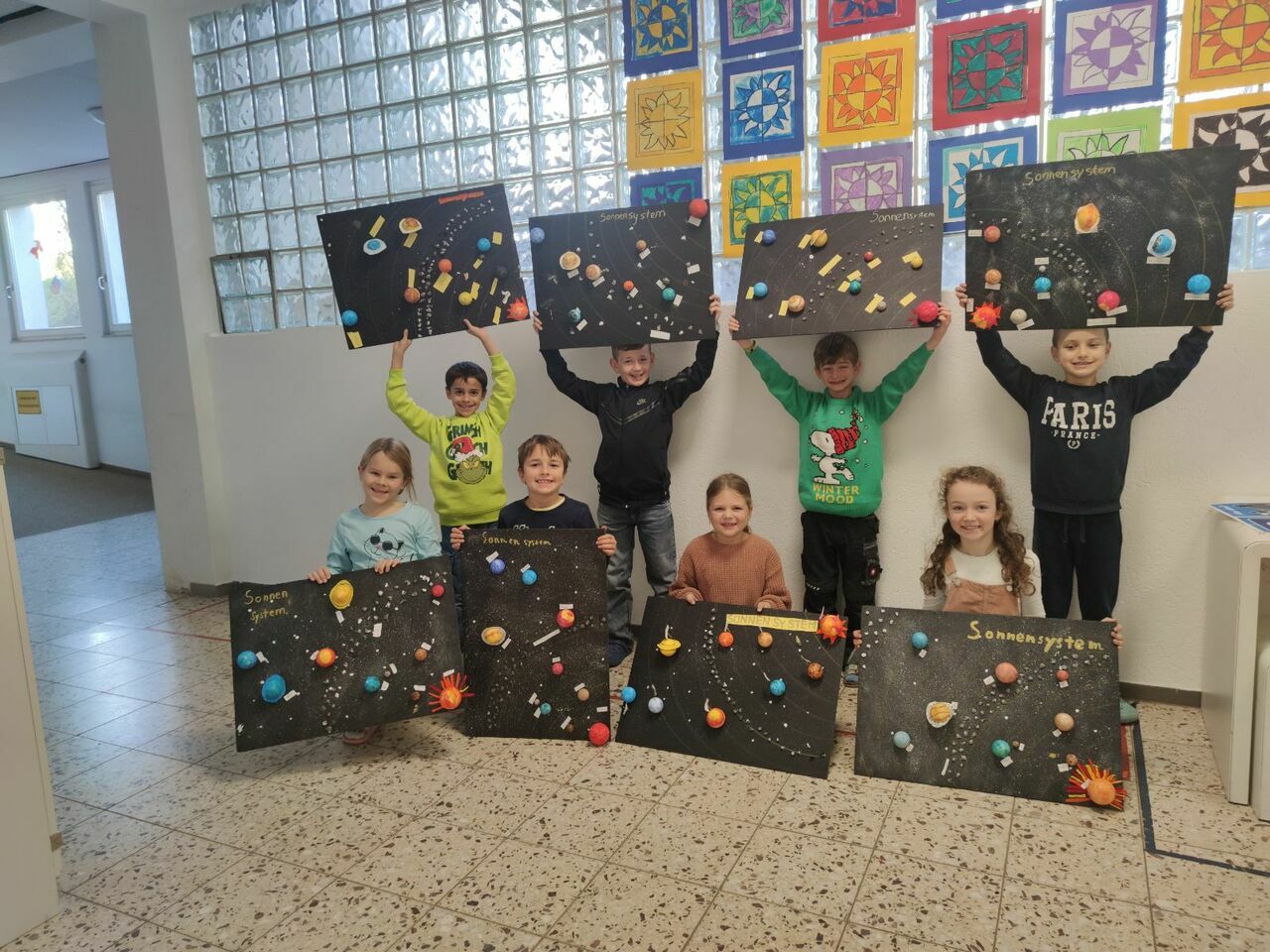 Für das Unterrichtsthema „Planeten“ hat die Klasse 2b ein Sonnensystem gebastelt.